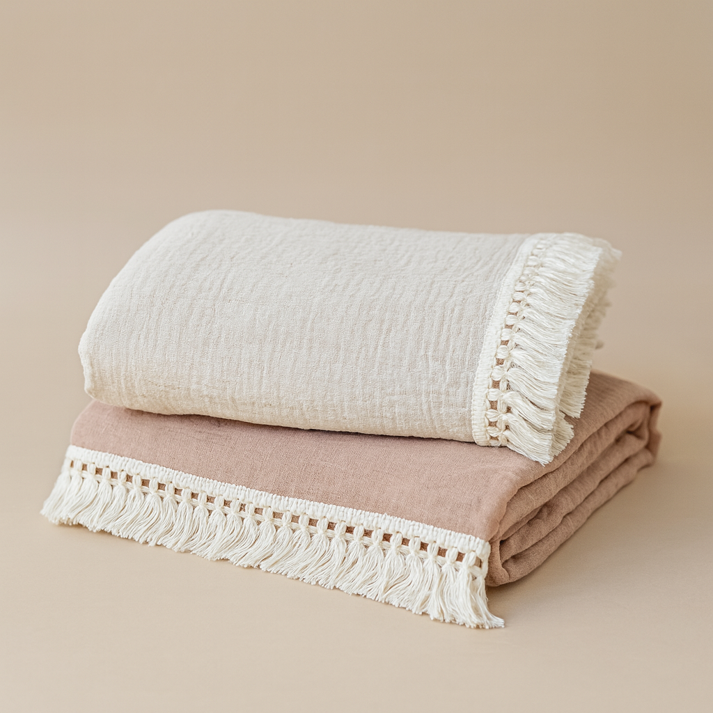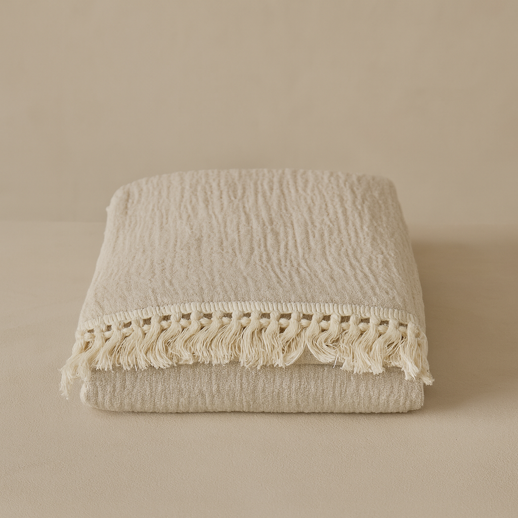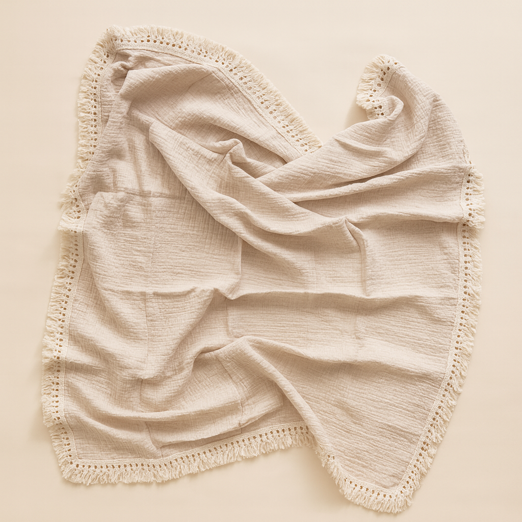 De Vea is een luchtige, zachte mousseline doek van 100% katoen, perfect voor elk seizoen. Met haar lichte, natuurlijke tinten en subtiele franjes straalt ze rust en warmte uit. De royale afmeting van 100 x 120 cm maakt haar ideaal als wikkeldoek, picknickkleedje, strandlaken of knusse omslagdoek voor jou en je kleintje.
